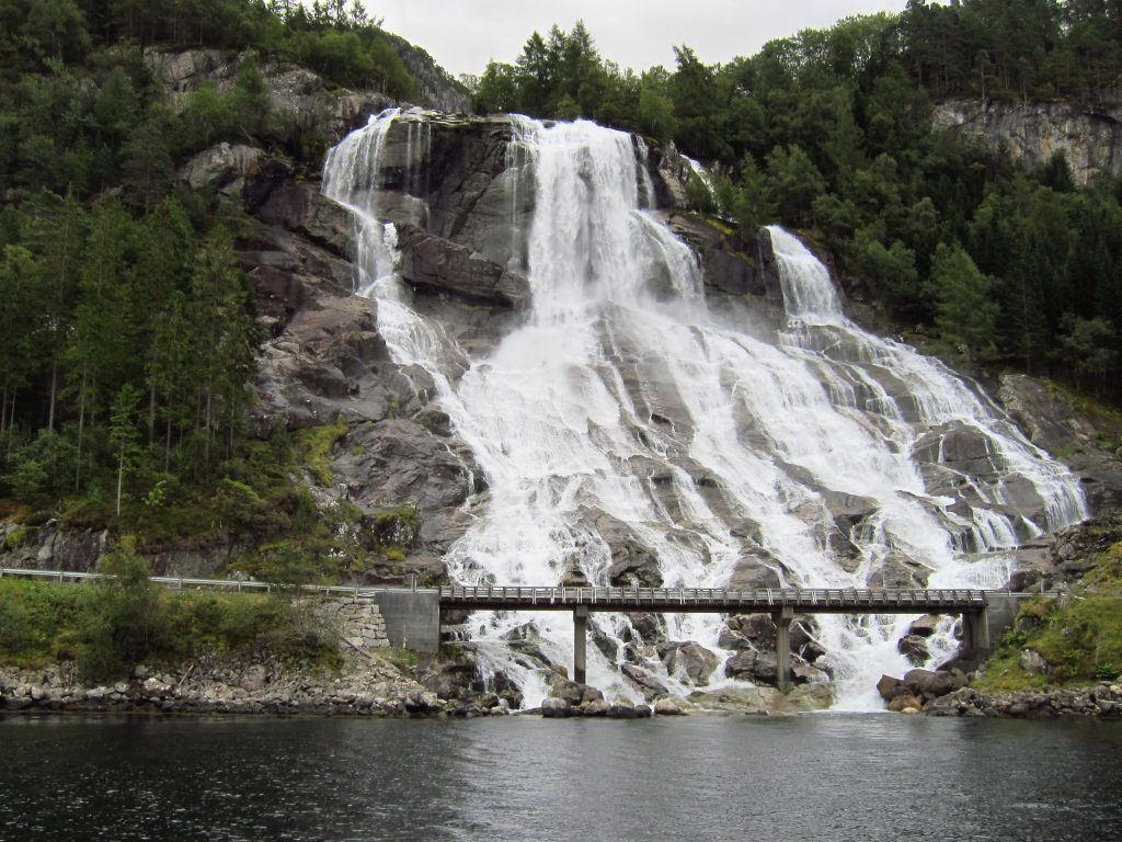 Just visible on the top of the mountains is the ice-cap glacier of Folgefonna which covers 207 sq. kmSome impressive “fossen” – FurebergfossenWith the wind starting to fail, we decided to turn right up the side fjord to SundalComing in to moor at SundalThe outflow glacier of Bondusbreen from Sundal. The ice road from the village to the glacier was used to transport ice down from the glacier to the fjord and thence across Europe.The glacial lake of Bondhusvatnet at 190 metres above the fjord, sitting on the boundary of the National Park. Some of us walked on the additional distance to the waterfall seen at the other end of the lake…